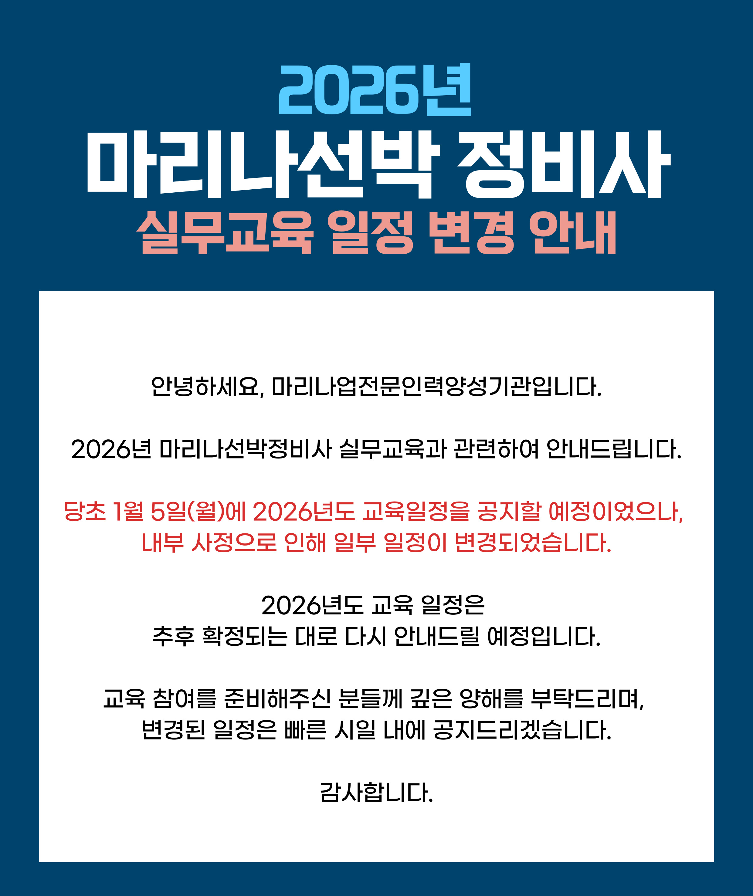 2026년 마리나선박 정비사 실무교육 일정 변경 안내